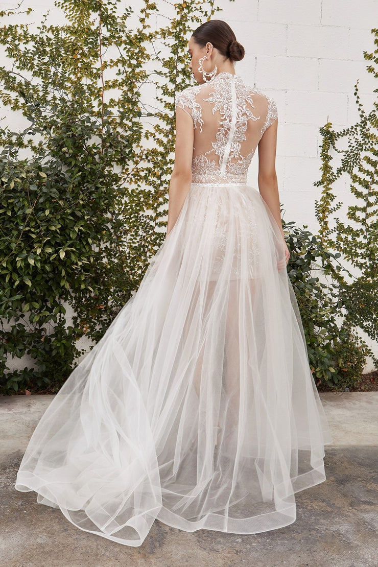 The Evangeline can be worn two ways: classy A-line wedding dress for the ceremony and cute mini dress for the afterparty. A thoroughly modern bridal look, this mock neck dress features a classic cap sleeve with a separate tulle skirt attachable with a belt. The beaded lace with a floral motif is lined with nude stretch lining. This is a gown for a bride with an elevated sense of style.