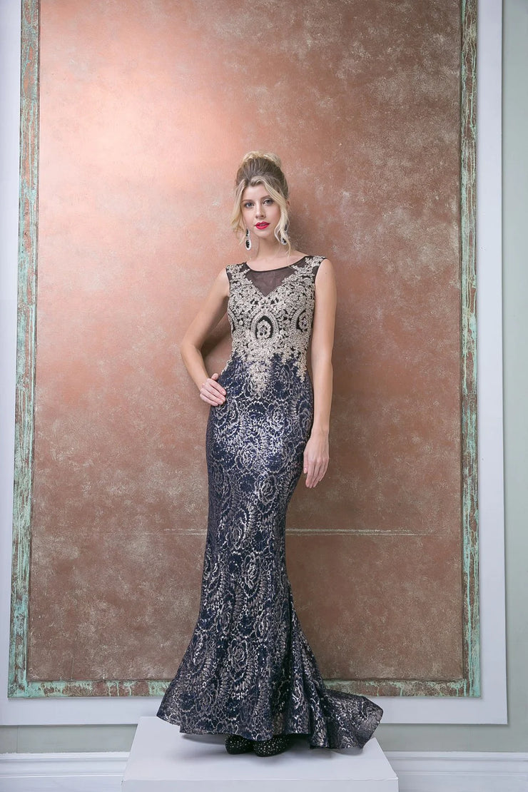 Make a grand entrance that will surely wow the crowd in this glamorous Cinderella Divine 8933 creation. Appliqued with stunning metallic lace studded with rhinestones, this dainty piece features an illusion scoop neckline draped with cap sleeves. Fabricated with an illusion full back and a trail of lace, the sequined mermaid skirt glimmers as it finishes with a romantic train. Make them stare in this irresistible Cinderella Divine masterpiece.