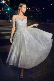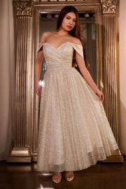 tea-length with an off-the-shoulder bodice and a sweetheart neckline. The fabric has a glittery sparkle, perfect for engagements, elopements, or rehearsal dinners. It's elegant, comfortable, and ideal for any type of wedding celebration, making it a stunning choice for your special day...