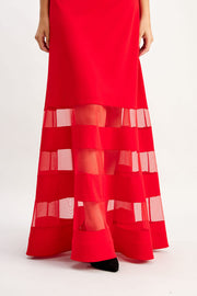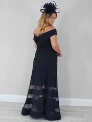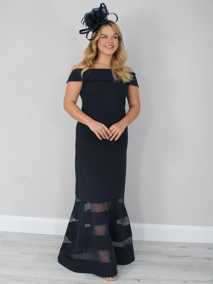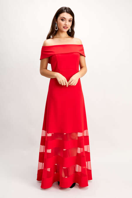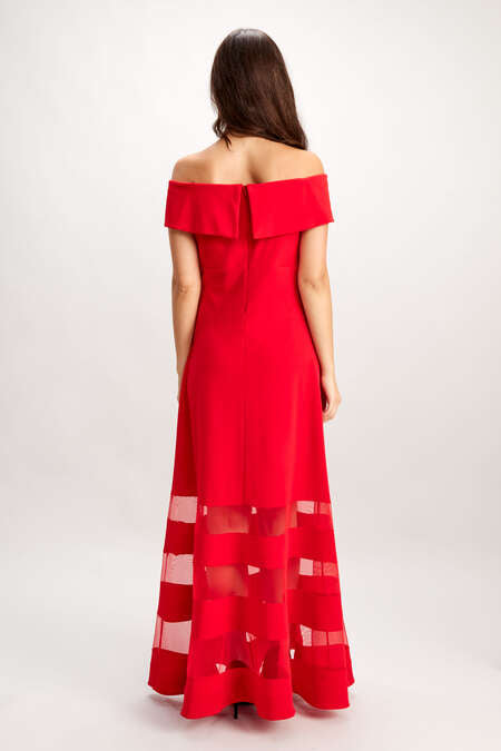Step into the spotlight in this stunning floor-length gown. Its off-the-shoulder design highlights your decolletage with timeless elegance. The gown features a captivating blend of mesh and opaque panels that start at the knees and continue down, creating a flattering and elongating silhouette.