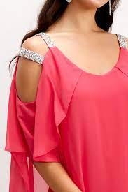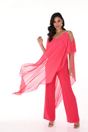 he pantsuit is designed with boldness and festivity in mind, featuring double rhinestone straps that add a touch of glamour and sparkle. The neckline is beautifully trimmed with a large piece of semi-sheer chiffon, which adds a graceful, flowing detail to the ensemble. The combination of these elements creates a sophisticated and eye-catching look that balances boldness with beauty.