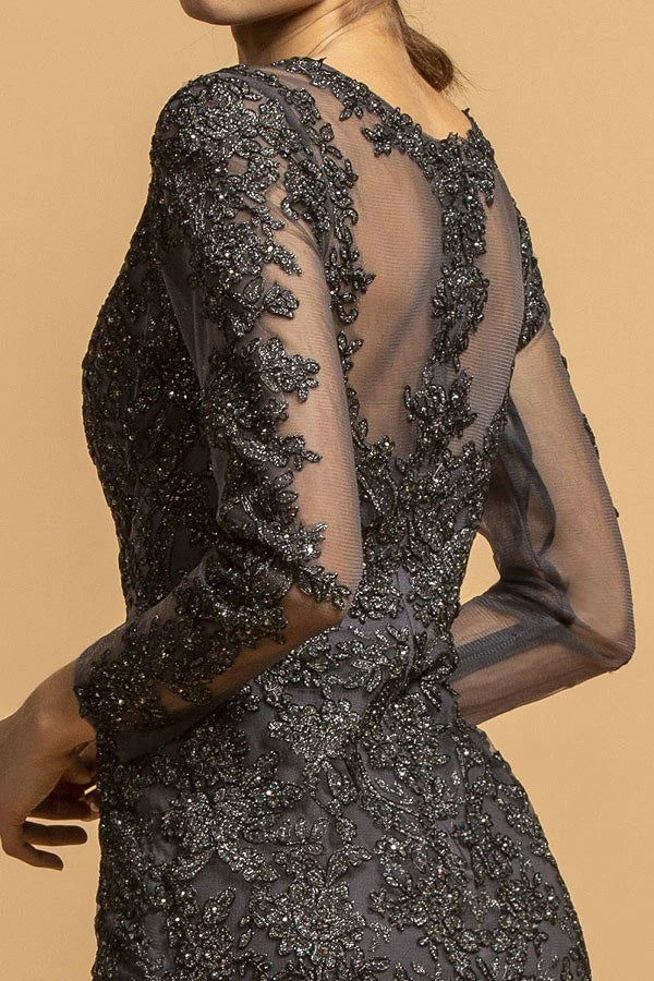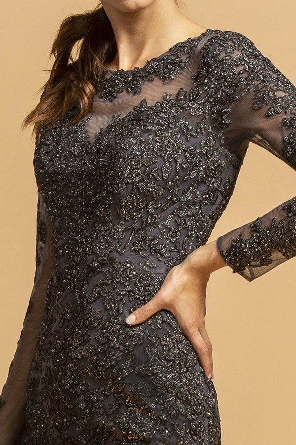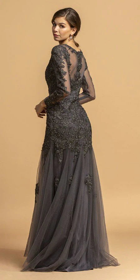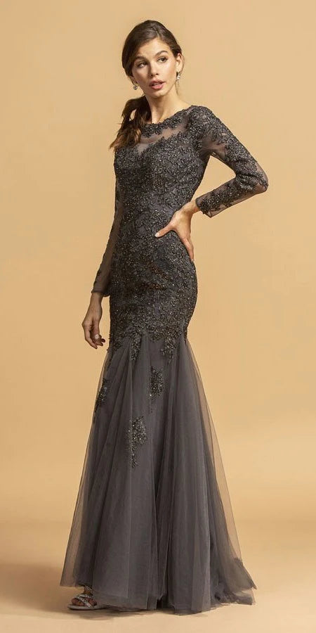 Long sleeved floor-length formal dress by Aspeed Design L2182 is decorated with shimmering bead-appliques. This mermaid style evening gown features a see-through panels along the round neckline, sleeves and back with zipper. A long formal dress excellent for prom, red carpet, awards night or in any special and modest events.