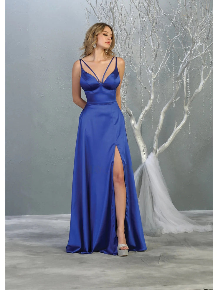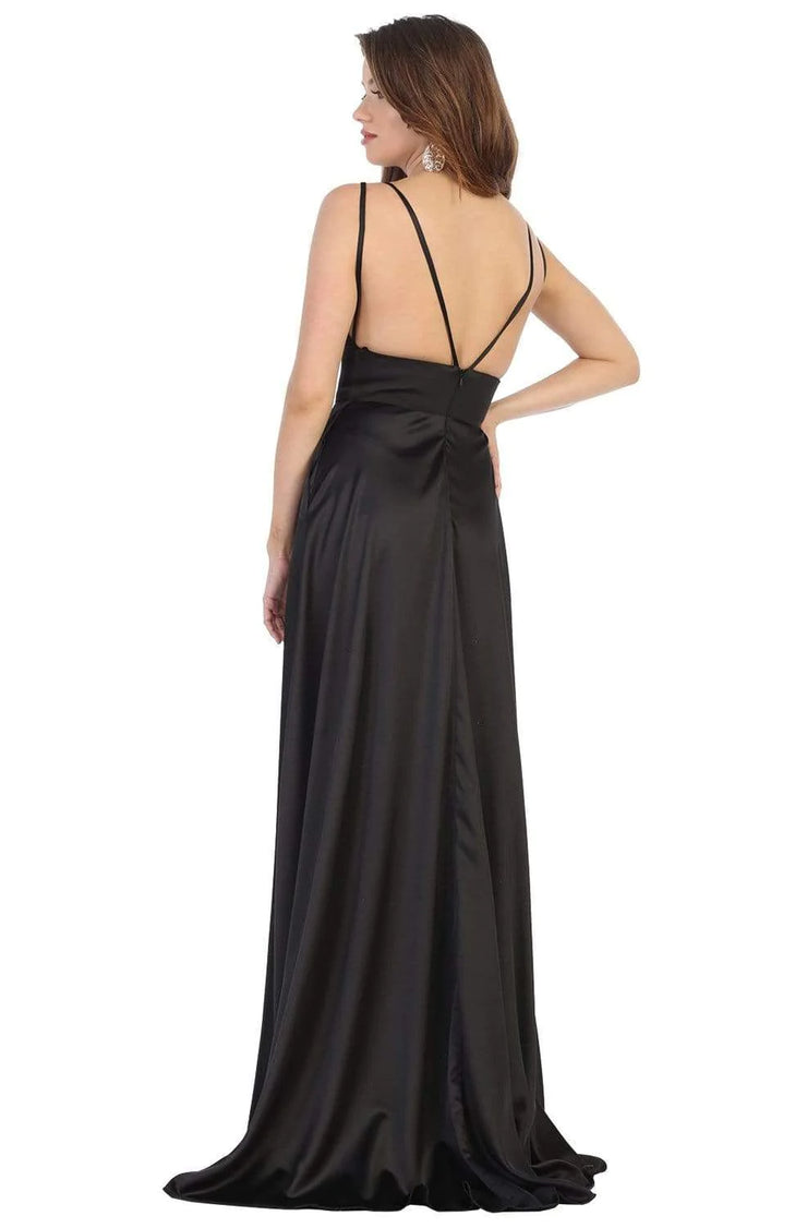 Look and feel like a statuesque beauty in this classic May Queen MQ1705 creation. Stringed with a v-style strap adornment connecting the bodice, this dress reveals a deep v-neckline coupled with a low strappy back. Softly flaring in a sleek fabric, the A-line skirt beautifully opens with a high slit and ends with a sweep of train. Be an emblem of elegance in this May Queen masterpiece.