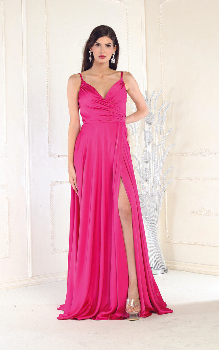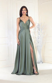 See yourself swaying into the room in this beautiful May Queen MQ1945 long and formal evening gown. A classic satin fabric with a v-neckline and a-line silhouette will have you picture perfect! With a sexy thigh high slit, sleeveless adjustable straps, this dress will have you ready for any special occasion.