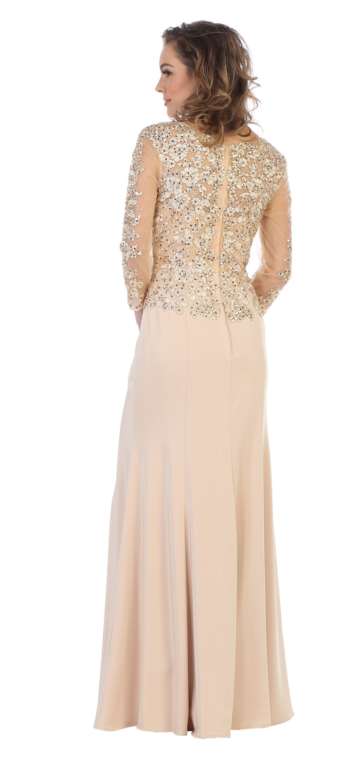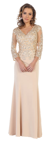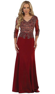 Enter the party and do that walk of a regal beauty in May Queen MQ1505. The dress graces in quarter length sleeves and a V-neckline embellished with lace appliques over the sheer and nude lined bodice. The skirt tapers through the thighs and runs in floor length hem. Simplicity and elegance as defined by May Queen.
